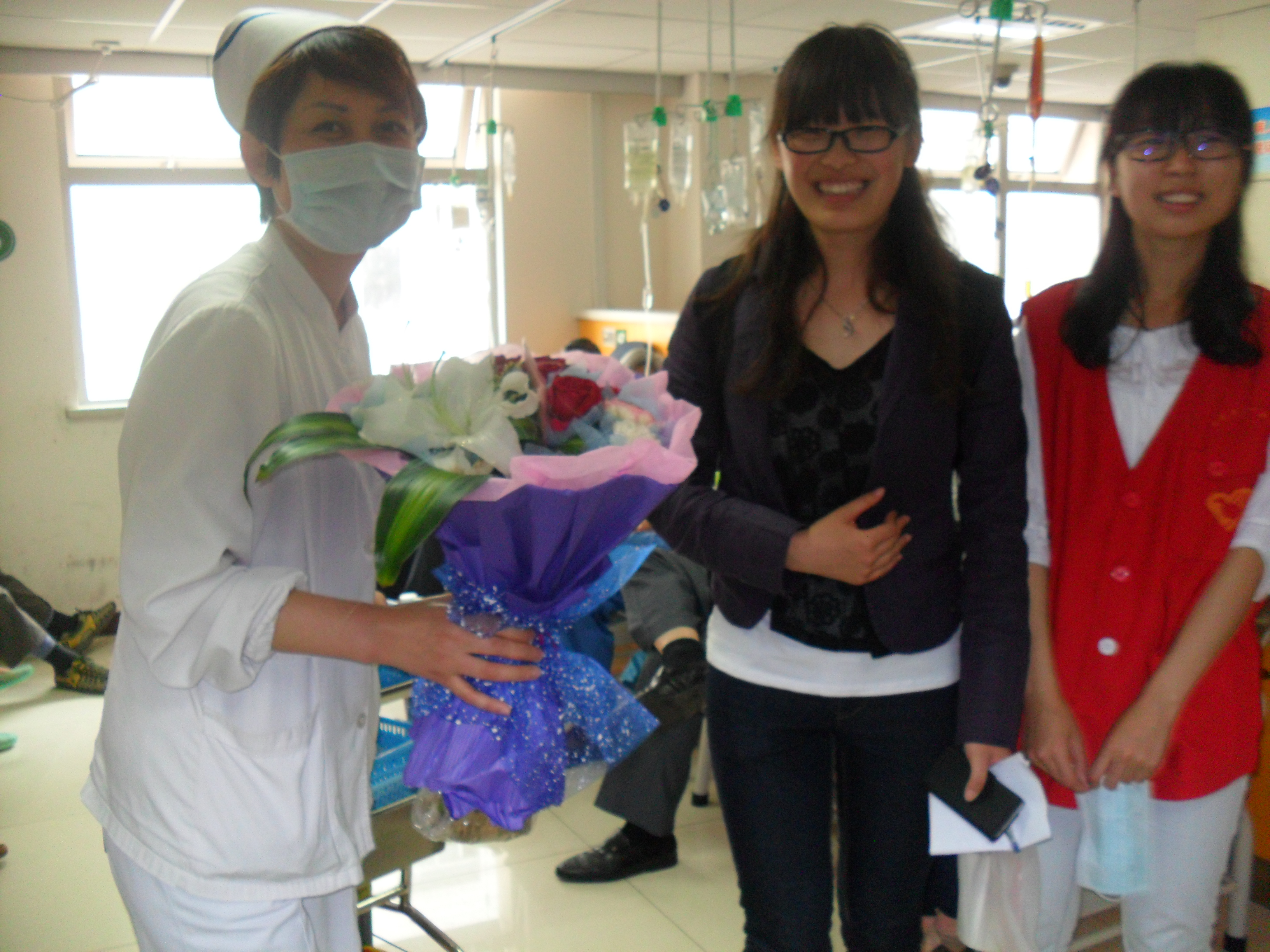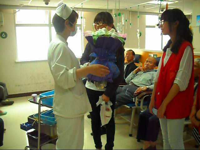 5月12日的8点半所有人员在北门集合后向义乌进发取花,9点准时出发。我们有纪律有组织地分别奔赴南京市儿童医院,南京市第一人民医院,四五四医院,鼓楼医院。经过大约一个小时的跋涉,分别到达各家医院。随后找到平时我们开展志愿者活动病区的护士长,说明了我们的来意,并献上我们最忠诚的祝福和花束。欣喜的是病区的护士都非常开心得到我们的祝福,同时也非常感谢我们的到来。