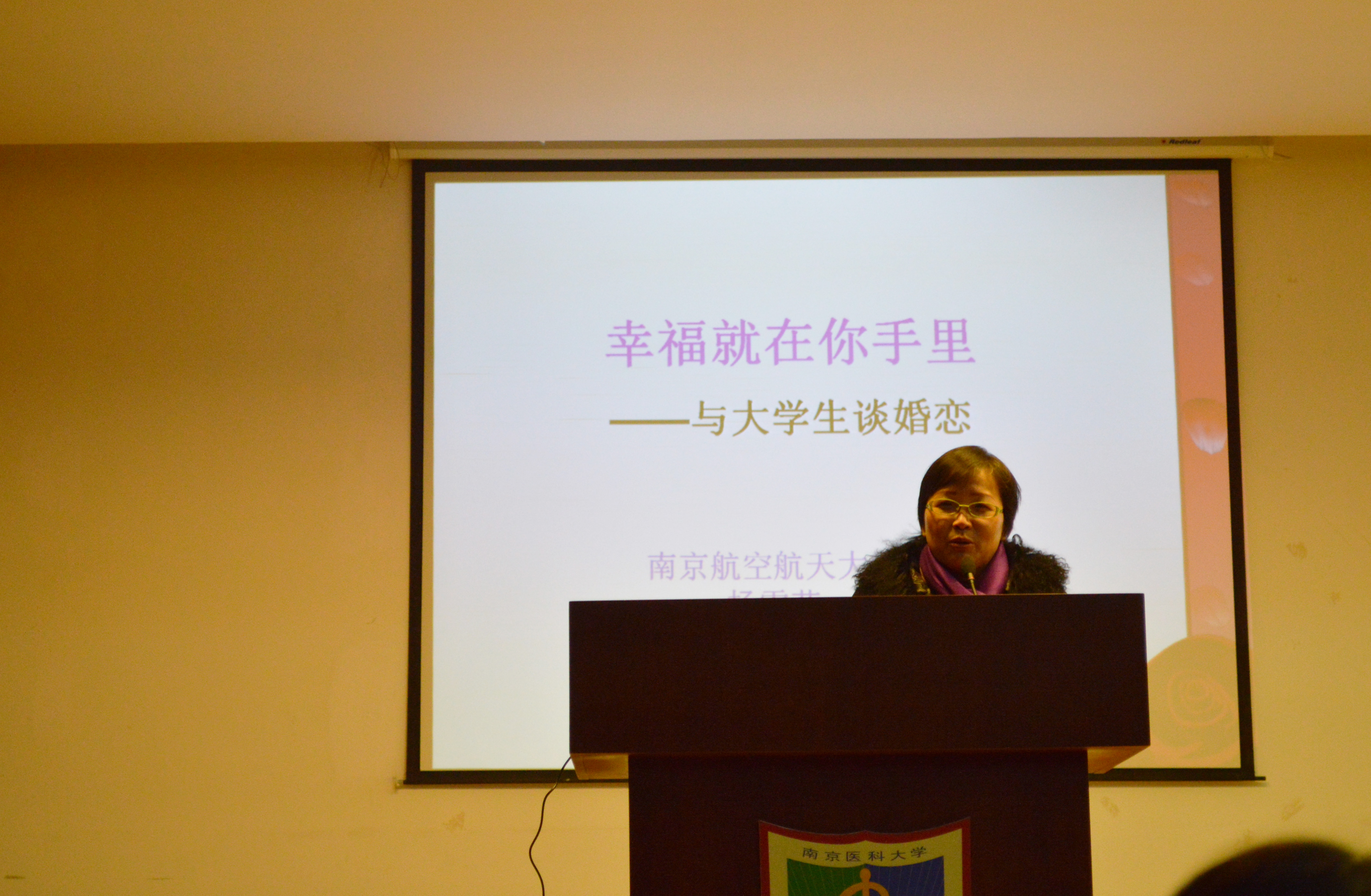 2014年12月2日,在南京医科大学护理学院技术部组织下,由南京航空航天大学的杨雪花教授主讲的有关“大学生婚恋观”的讲座在志诚楼报告厅开讲了。杨教授开场以讨论大学生心理问题带动了场上的气氛,同学们的脸上挂满了笑容,可见教授演讲的魅力之大。