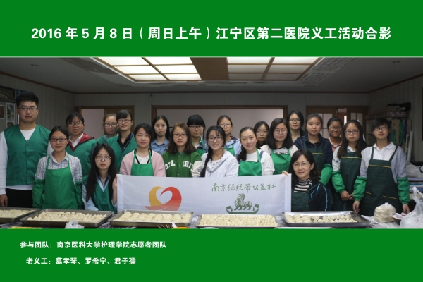 2016年5月8号8:00,南京医科大学护理学院14级的21位同学在吴刚和赵倩倩两位负责人的带领下参加了此次江宁二院的志愿者活动,此次活动的主题为包饺子。