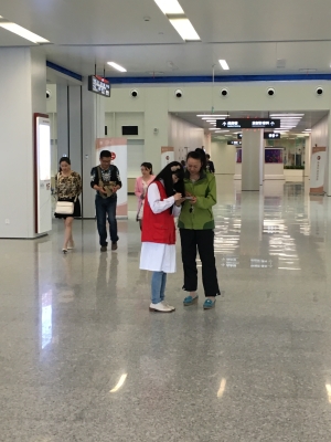 今天虽然是工作日,但是前来医院看病的人不是很多。志愿者们从下午1:30一直呆到5:00,在这三个半小时的时间里,大家一直坚守岗位,为患者及家属提供各种帮助,并介绍医院的相关环境。刘彦麟和王婷同学在大厅门口作介绍;王雅璇同学在楼梯口引导;鲍雅莲和朱宏敏同学在二楼大厅接待;严海燕同学三楼大厅指引。每个人都十分尽职、尽责,大家从不熟悉逐渐开始对医院的内部环境了如指掌并积极主动地问询患者的需求,志愿者们从容地回答患者和家属的各种问题,并为他们解决问题。