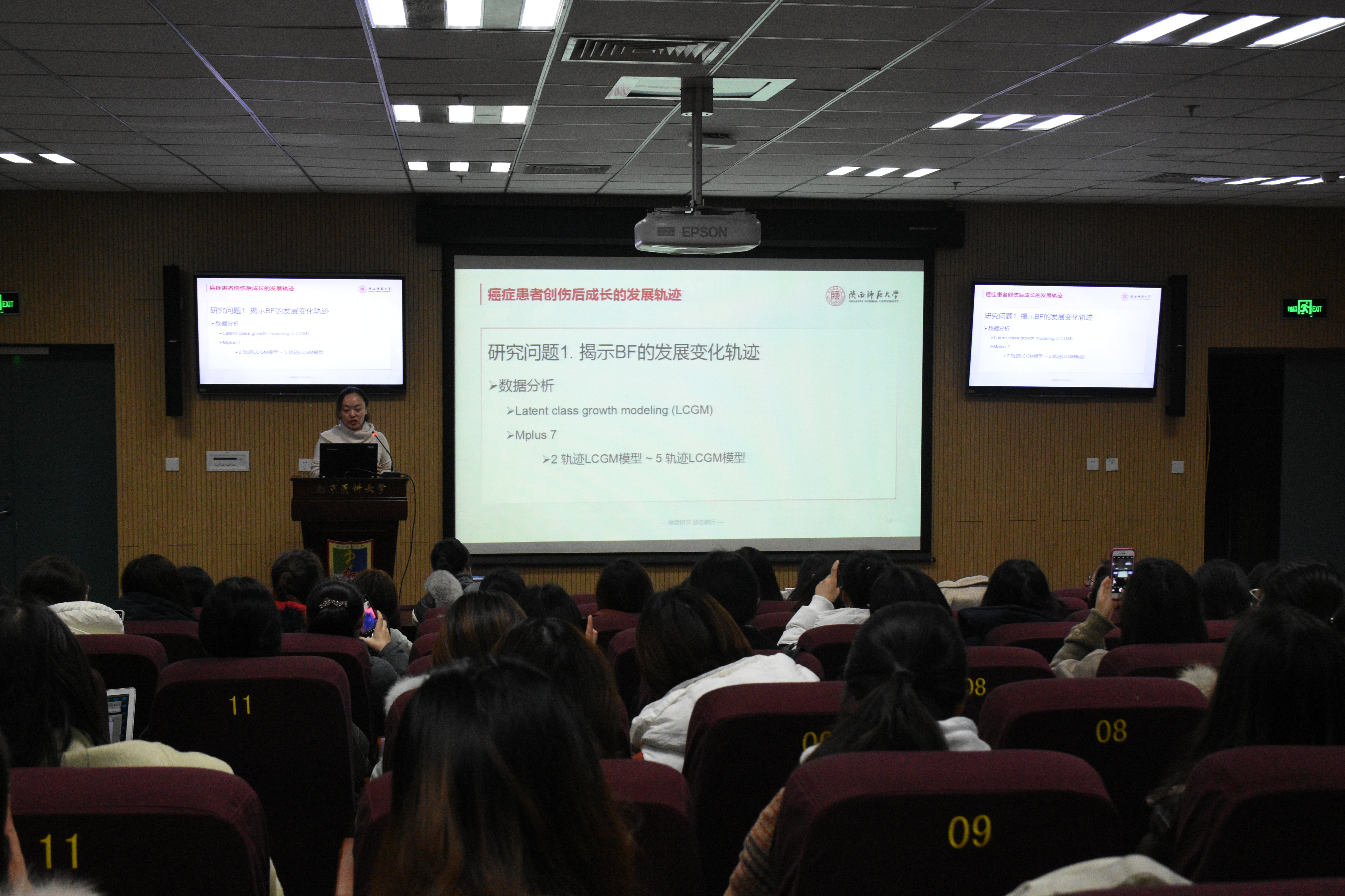 首先,来自陕西师范大学心理学院的朱蕾副教授带来题为“心理发展变化轨迹的研究方法”的主题报告。她以肿瘤学研究为例,从什么是发展轨迹如何研究发展轨迹以及研究实例三个方面向大家详细介绍了轨迹研究的方法与流程。