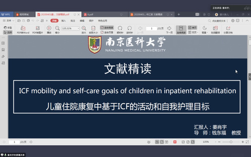 学系2019级研究生焦雨晨、姜肖宇、裴启晓、周如华共4位同学分别就老年的记忆问题、ICF、面部焦虑量表、血液透析患者猝死的预测因子几个主题内容进行了读书报告,为同学们带去了一些新的科研进展和专业知识分享。研究生汇报完毕后,同学们纷纷踊跃提问和探讨,现场气氛非常活跃。接着,老师也对汇报的内容进行了提问和拓展,为汇报者带去了新的研究思路,同学们纷纷表示自己受益匪浅。最后,老师们充分肯定了此次读书报告的效果和意义,同时也希望同学们在接下来的读书报告会中,增加一些批判性思维,思考文章的不足之处,考虑与之后的学位论文之间的关系。要有更多的发散性思维,不仅仅局限于围绕这一篇文献来讨论,要多阅读其它一些相关的研究进展。读书报告会在一片热烈的掌声中划上了圆满的句号。