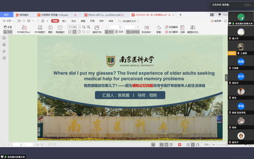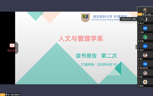 为进一步提升研究生阅读能力,夯实理论基础,4月1日晚18点,护理人文与管理学系积极开展研究生线上读书报告会。本次读书报告会由张弛同学主持,学系钱东福、姚俊、樊宏、嵇艳等研究生导师和全体研究生参加了会议。