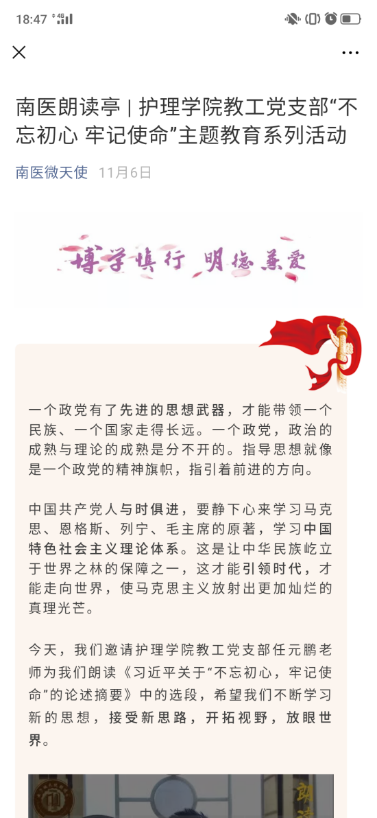 今天,我们邀请护理学院护理学院教工党支部任元鹏老师朗读《习近平关于‘不忘初心、牢记使命’的论述摘要》中选段“提升党的建设”,希望我们在学校中起到带头作用,提升各方面建设。