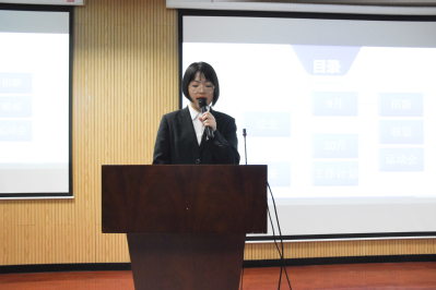 副主席杨程颖简短的总结了学生会的招生工作,展示了近期开展的联谊活动、运动会,以及表达未来期望。