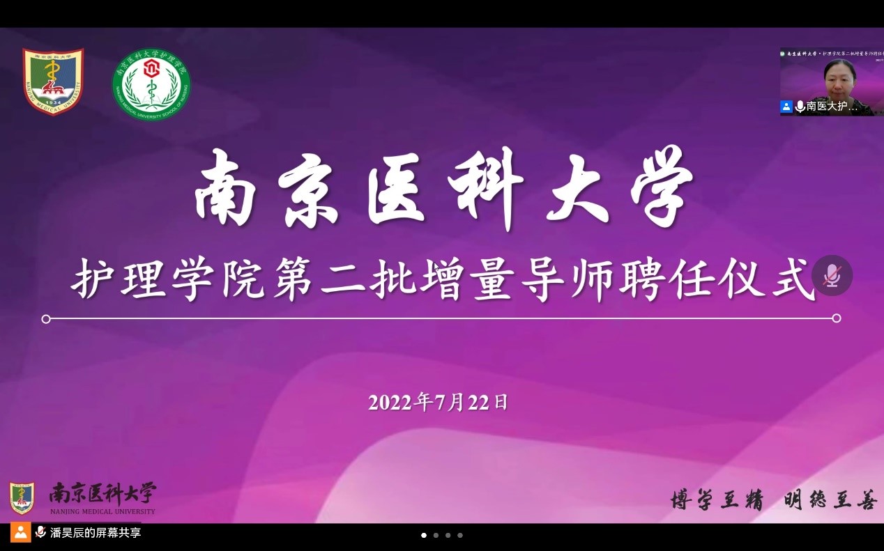 7月22日,南京医科大学护理学院第二批增量导师聘任仪式在线上顺利举行,南京医科大学研究生院吴文明副院长、研究生院培养办陈丞主任,护理学院陈龙书记、许勤院长、苏益民副书记、丁亚萍副院长,各学系主任,全体增量导师和研究生代表参与了此次聘任仪式。仪式由丁亚萍副院长主持。
