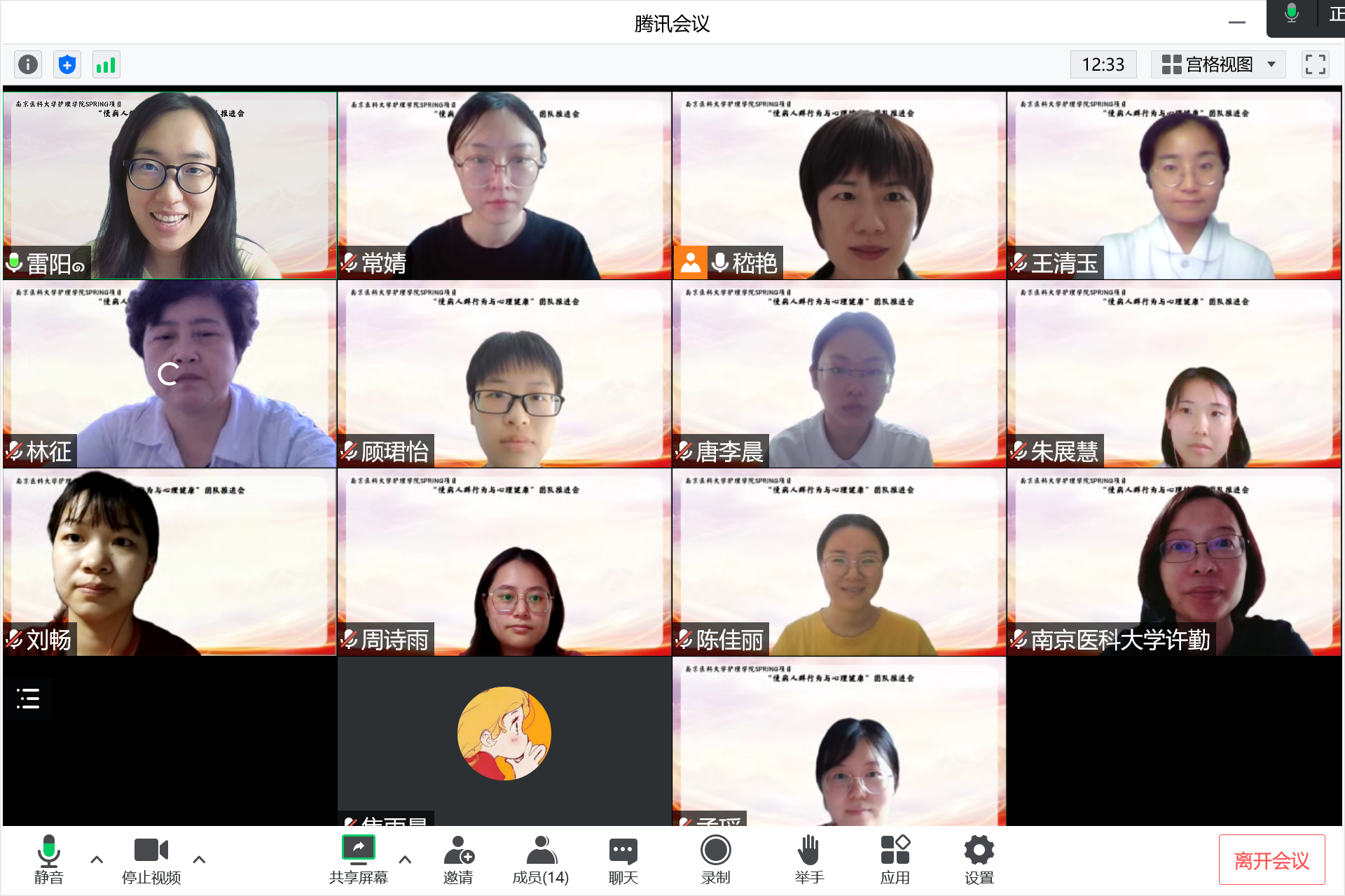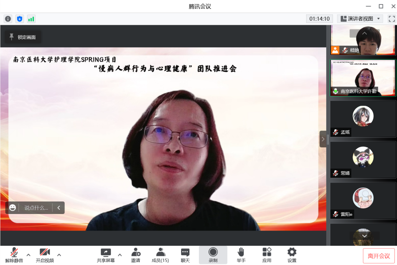 2022年7月27日,我院SPRING科研创新团队-慢病人群行为与心理健康,在线上顺利召开团队建设推进会,护理学院院长许勤教授、团队指导老师林征教授及团队全体师生参加会议,会议由团队项目负责人嵇艳副教授主持。