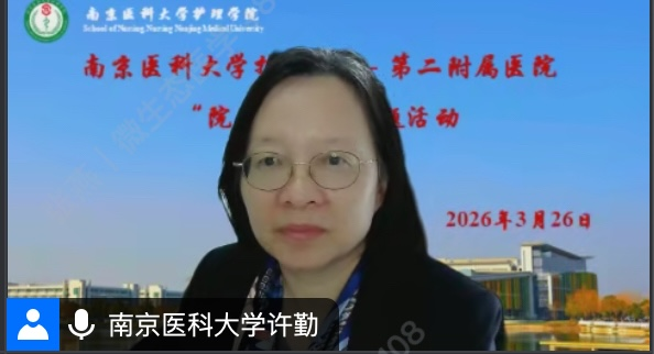春启金陵,万物竞秀。3月26日下午,由护理学院主办、第二附属医院承办的2026年第一期“院院融合”主题活动以线上直播形式圆满举行。护理学院许勤院长、陈明霞主任、各附属医院护理管理者及临床护理骨干跨越时空阻隔,齐聚云端,围绕“融合、赋能、链动:构建‘全院一张床’模式下慢病全程管理新生态”主题,共话护理学科发展新路径,共绘院院融合新蓝图。